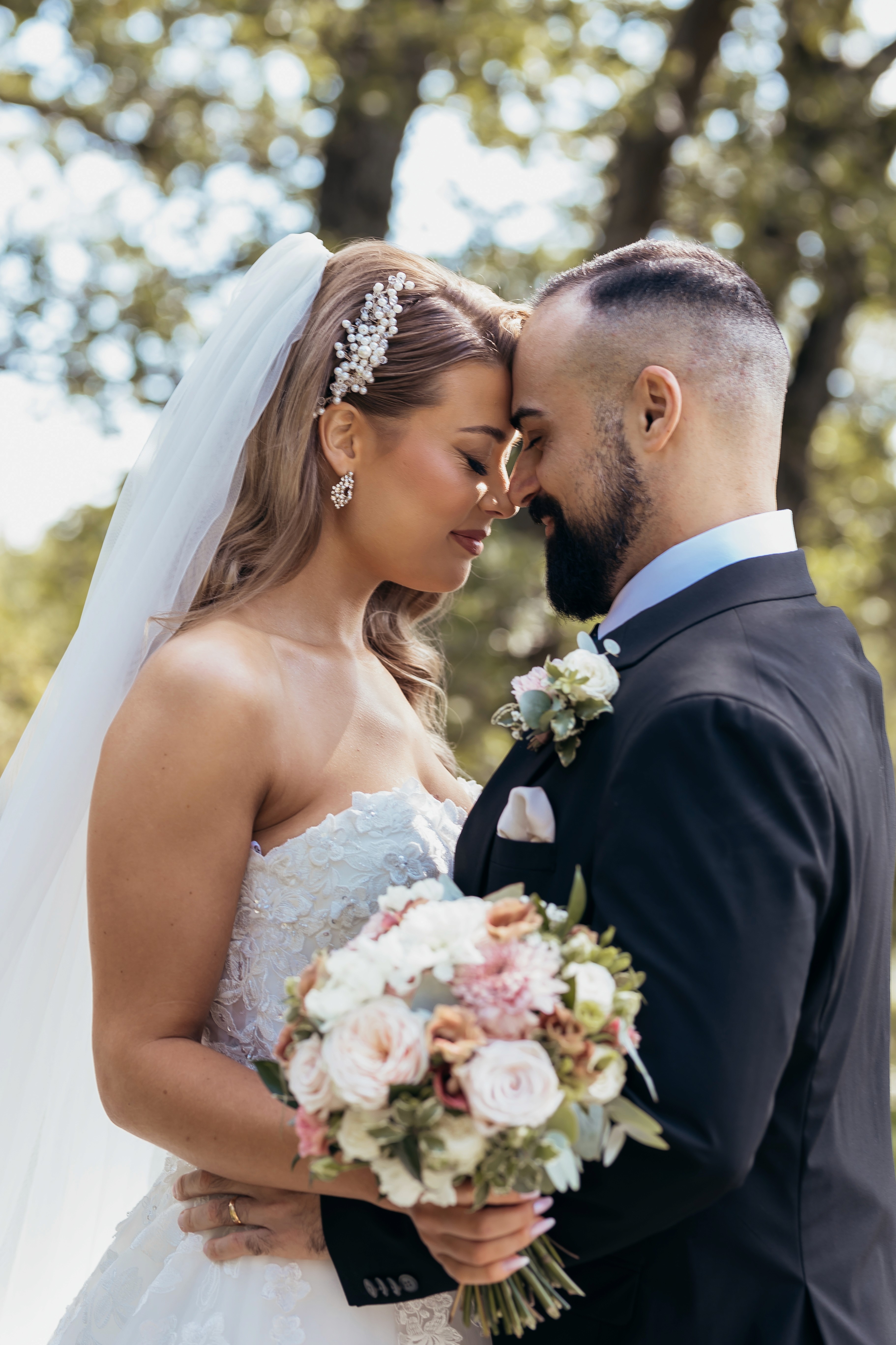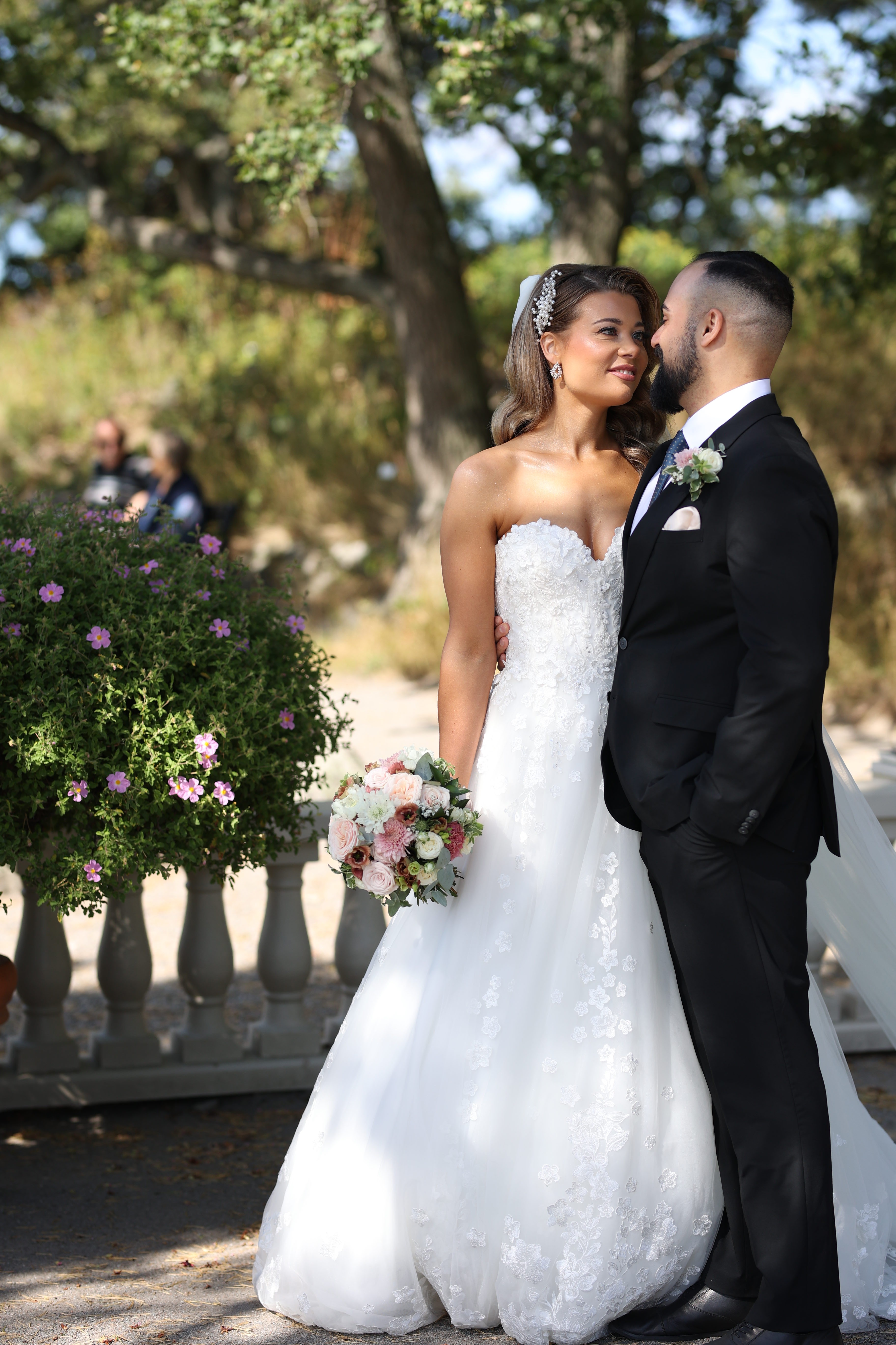 Porträtt av brudparet, vigsel, brudfölje och familj samt gratulationer/mingel i samband med vigseln